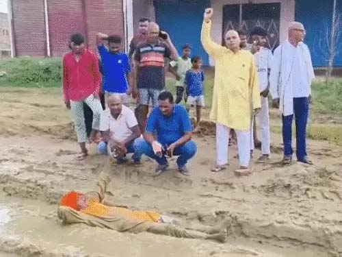इसी बात को लेकर रविवार को सुबह 10 बजे हिंदू युवा वाहिनी के कार्यकर्ता मौके पर पहुंचे। जर्जर सड़क का निर्माण पूरा करने की मांग करते हुए प्रदर्शन करने लगे। कार्यकर्ता प्रदर्शन का मोबाइल से वीडियो बना रहे थे, तभी संगठन के पूर्व जिलामंत्री और पिपरा वार्ड अरुण सिंह सड़क पर फैले कीचड़ में लेट गए और लोटने लगे।