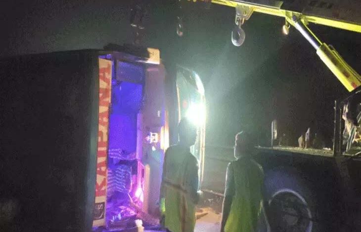 नोएडा से कानपुर जा रही बस मथुरा में पलटी: ड्राइवर को नींद आने पर डिवाइडर से टकराकर पलटी