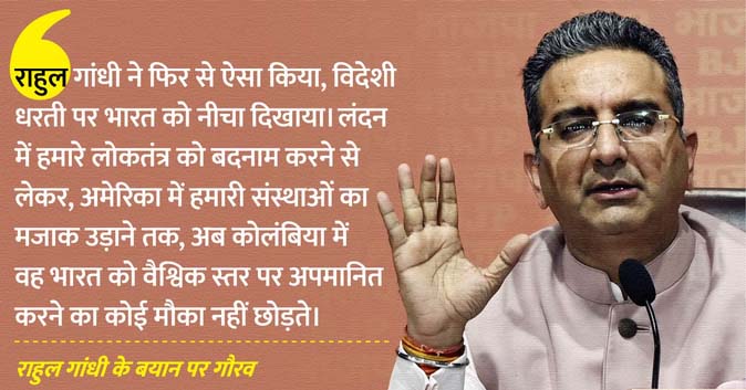 नई दिल्ली । कांग्रेस सांसद और लोकसभा में विपक्ष के नेता राहुल गांधी के कोलंबिया में दिए गए बयान पर भाजपा ने गुरुवार को तीखा हमला बोला है। राहुल ने कोलंबिया की ईआईए यूनिवर्सिटी में आयोजित सेमिनार में भारत के लोकतंत्र को लेकर बयान दिया था और देश में विभिन्न धर्मों, भाषाओं और परंपराओं के बीच उत्पन्न खतरों की बात कही थी। इस पर भाजपा नेताओं का कहना है कि राहुल गांधी विदेश जाकर भारत की छवि खराब करते हैं और लोकतंत्र की आलोचना का अवसर पाकर देश को अंतरराष्ट्रीय मंच पर बदनाम कर रहे हैं।