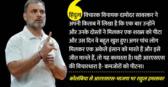 राहुल गांधी ने हिंदुत्व विचारक विनायक दामोदर सावरकर की किताब से एक घटना का जिक्र करते हुए कहा- ‘सावरकर ने लिखा है कि एक बार उन्होंने और उनके दोस्तों ने मिलकर एक मुसलमान शख्स को पीटा और उस दिन वे बहुत खुश हुए। अगर पांच लोग मिलकर एक अकेले इंसान को मारते हैं और इसे जीत मानते हैं, तो यह कायरता है। यही आरएसएस की विचारधारा है- कमजोरों को पीटना।’