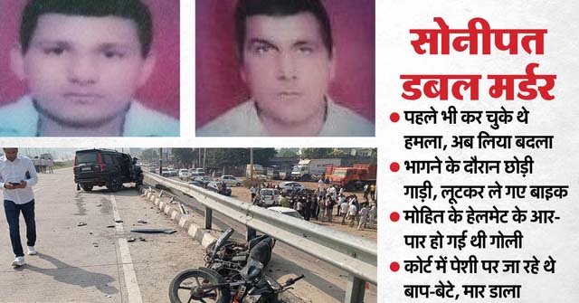 सोनीपत । सोनीपत के खरखौदा में कोर्ट में पेशी पर जा रहे पिता-पुत्र की शुक्रवार सुबह करीब पौने दस बजे नेशनल हाईवे-334बी पर थाना कलां चौक के पास गोलियों से भूनकर हत्या कर दी गई। स्कॉर्पियो सवार हमलावरों ने पहले उनकी बाइक को टक्कर मारी और फिर करीब 15 फायर किए। दोनों की मौके पर ही मौत हो गई। वारदात को पांच साल पुराने नितिन सैनी हत्याकांड के प्रतिशोध में अंजाम दिया गया। पुलिस की पांच टीमें आरोपियों की गिरफ्तारी के लिए जुटी हैं।