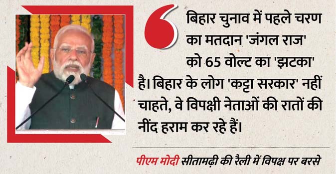 पटना । प्रधानमंत्री नरेंद्र मोदी ने सीतामढ़ी में विशान जनसभा को संबोधित किया। पीएम मोदी ने कहा कि मैं माता जानकी की प्रकट स्थली से संपूर्ण बिहार को प्रणाम करता हूं। पहले चरण के मतदान ने कमाल कर दिया है। उन्होंने महागठबंधन पर हमला बोलते हुए कहा कि पहले चरण के मतदान से जंगलराज वालों को 65 वोल्ट का झटका लगा है। आपका यह प्यार और उमंग देखकर स्पष्ट लगता है कि इस बार फिर से एनडीए सरकार बनेगी। आपका आशीर्वाद सबसे बड़ी ताकत है। पीएम मोदी ने “नहीं चाहिए कट्टा सरकार, फिर एक बार एनडीए सरकार” का नारा दिया। उन्होंने कहा कि यह चुनाव विकसित बिहार बनाने का चुनाव है। यह चुनाव आपके आने वाली पीढ़ी का भविष्य तय करेगा। इसलिए यह चुनाव काफी अहम है। इसलिए आपलोग पिछले हर मतदान का रिकॉर्ड तोड़ दें। बड़ी तादात में मतदान करें और हमारे उम्मीदवारों को अपना आशीर्वाद दें।