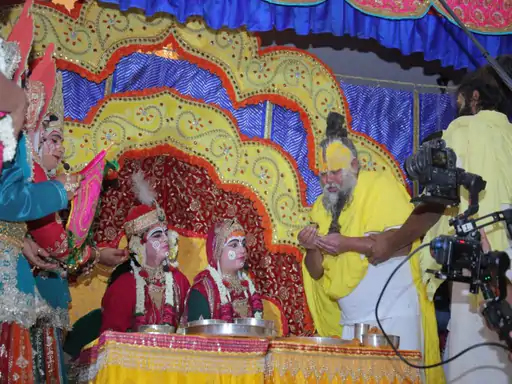 स्वामी कुंज बिहारी जी के निर्देशन में आयोजित अष्टयाम लीला में उत्सव के चौथे दिन राजभोग की लीला का मंचन किया गया। इस दौरान संत प्रेमानंद महाराज ने भगवान सीताराम के स्वरूपों को अपने हाथों से प्रसाद अर्पित किया।